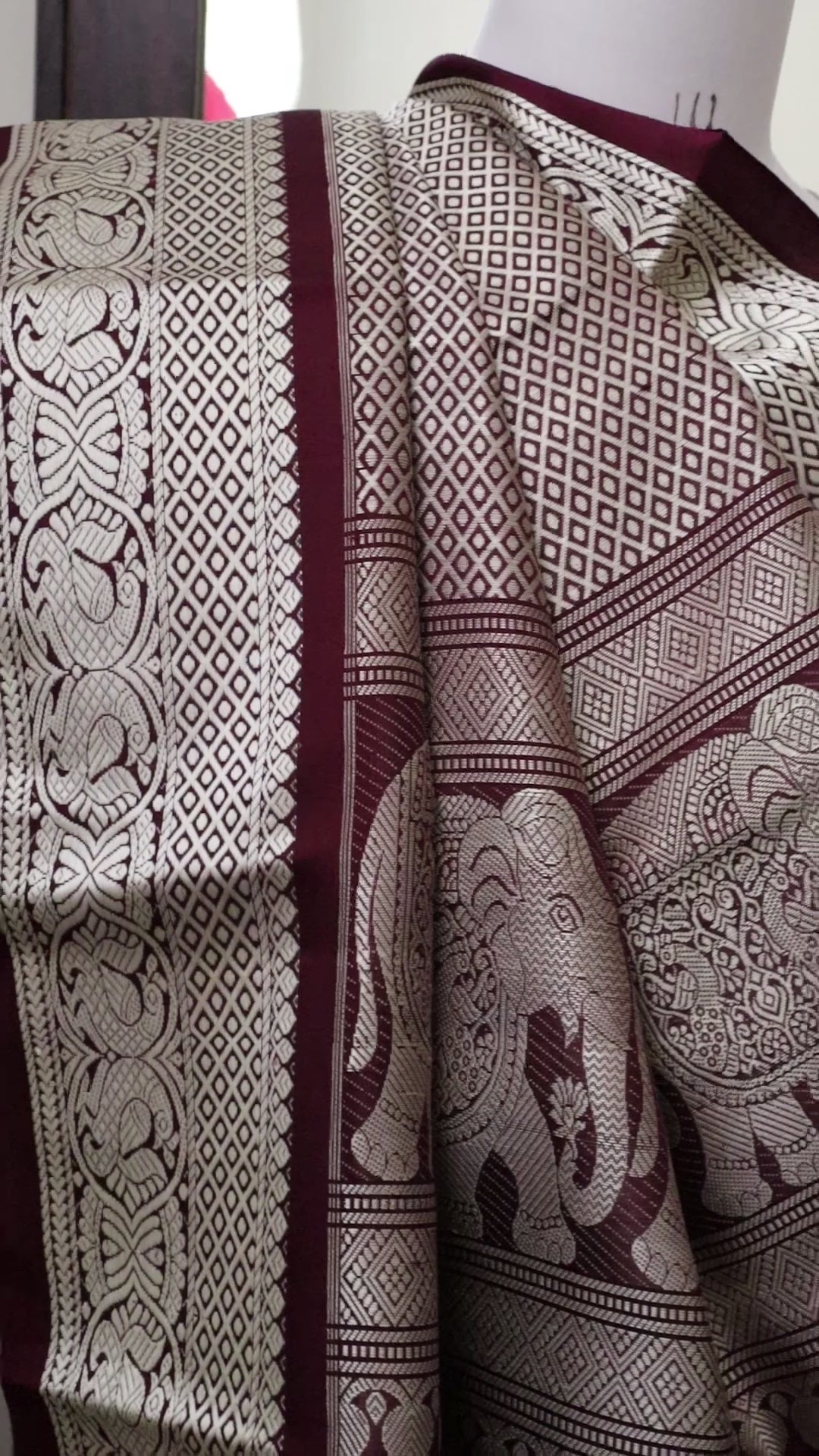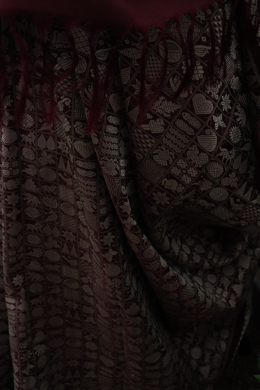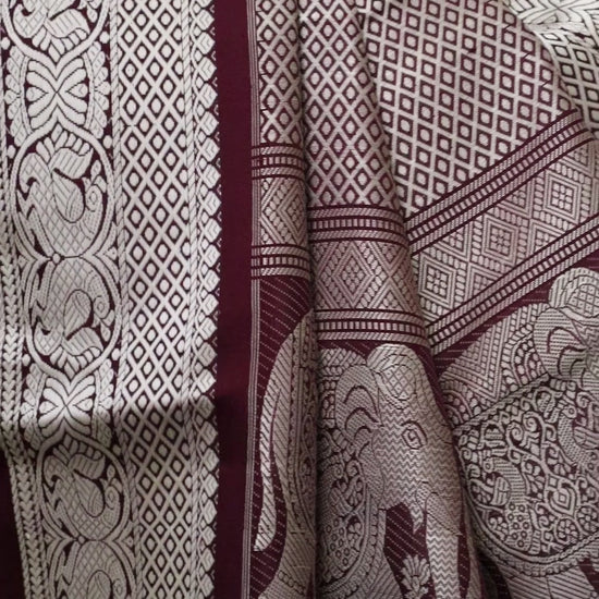 A stunning dual shaded brownish wine colour kanjeevaram silk with 36 of the most popular, classic motifs all over - done in pure resham - and tiny green dots of meenakari in those boxes.