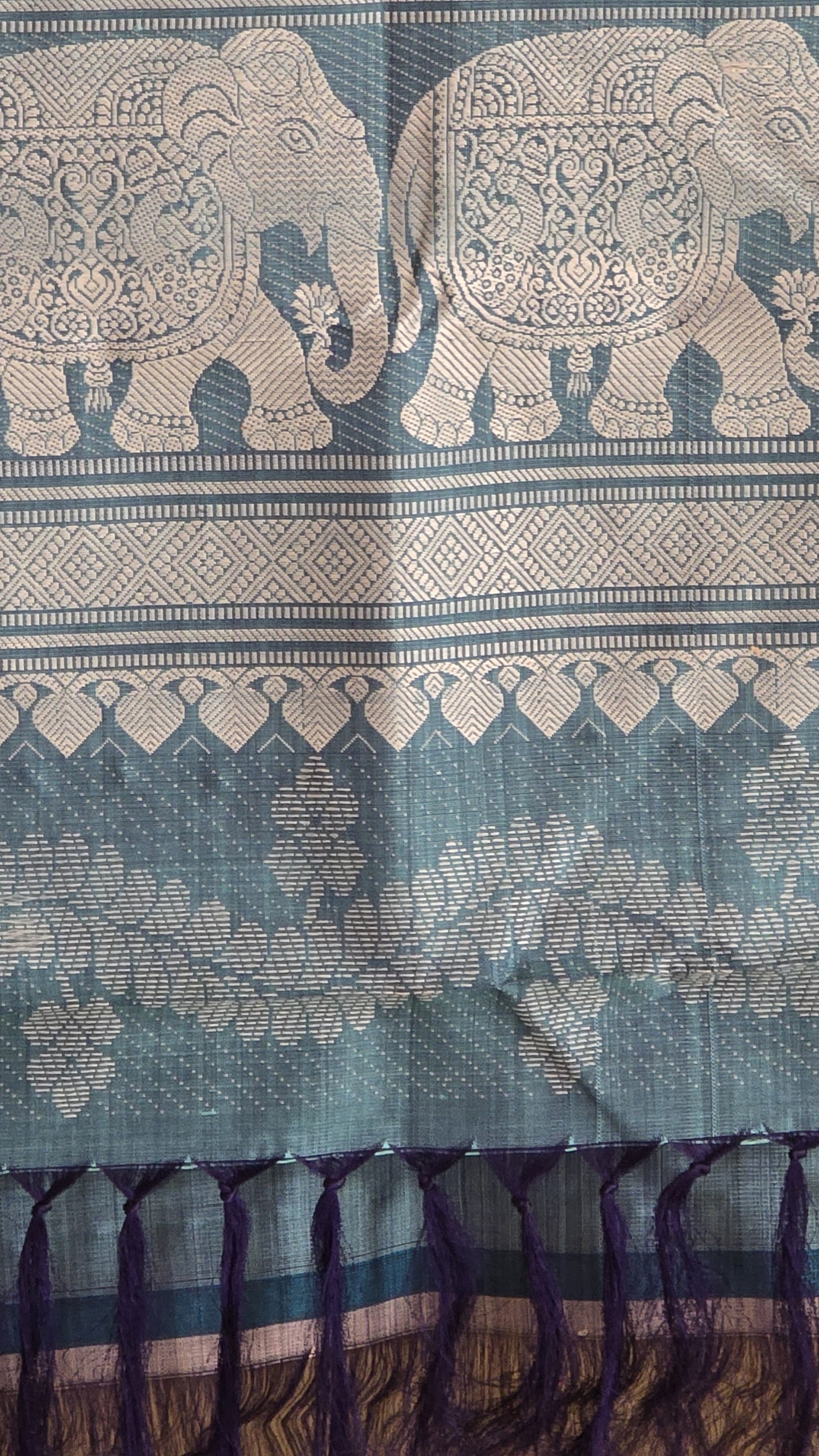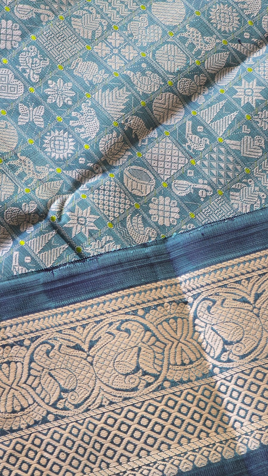 A stunning dual shaded Aananda with Bhuvana kanjeevaram silk with 36 of the most popular, classic motifs all over - done in pure resham - and tiny green dots of meenakari in those boxes.