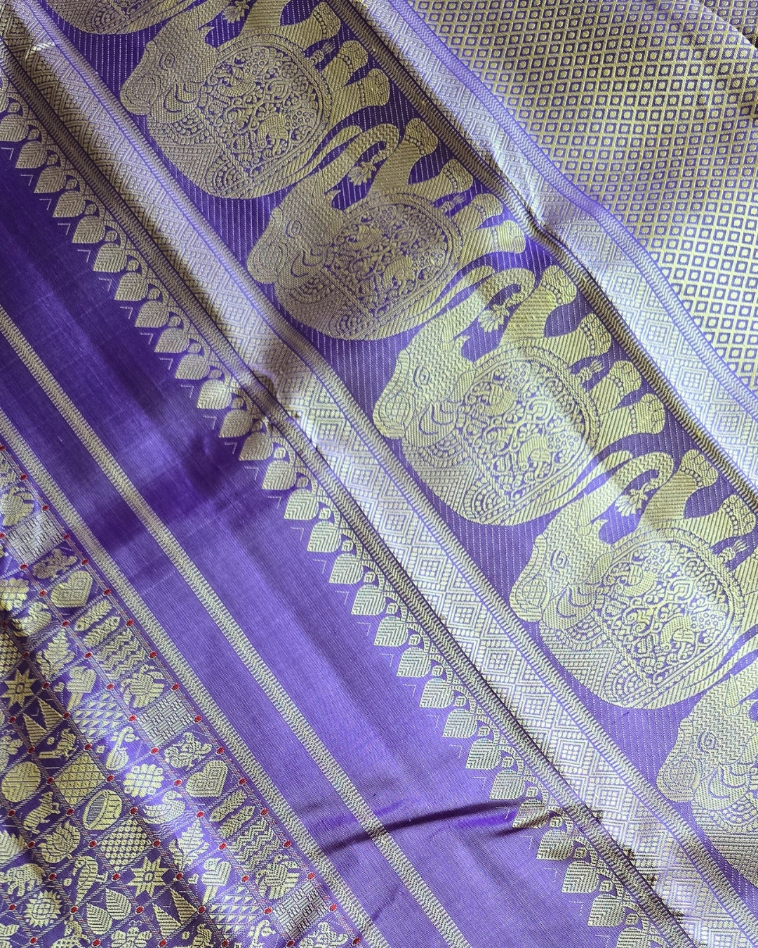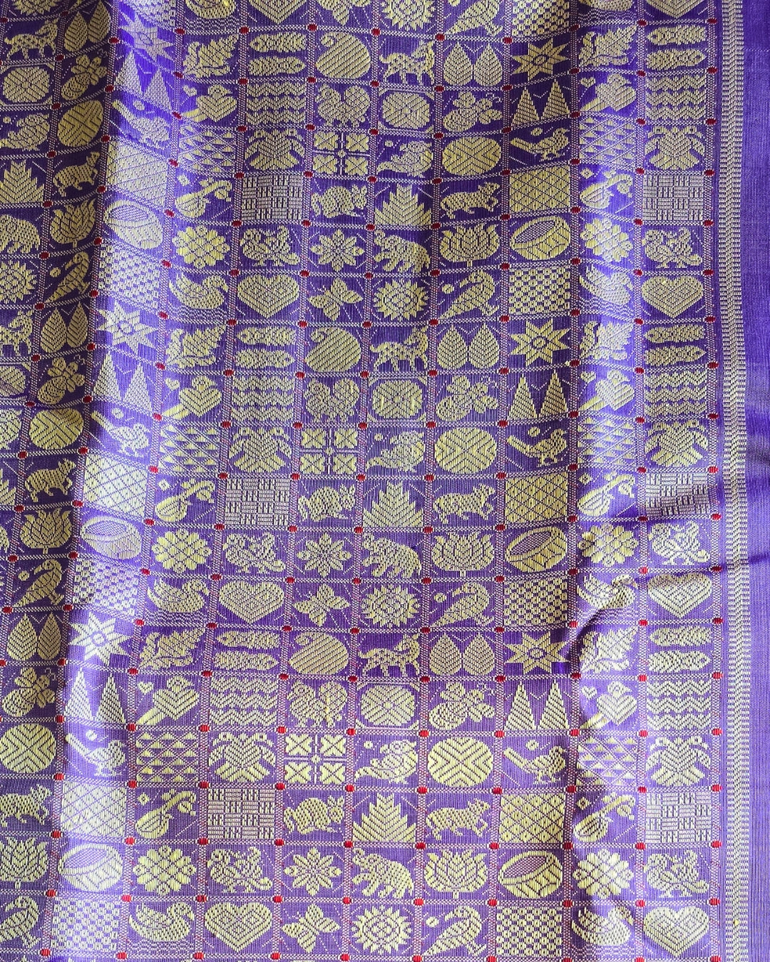 A light lavender (December Poo) threadwork kanjivaram silk with 36 of the most popular, classic motifs all over - done in pure resham - and tiny green dots of meenakari in those boxes.