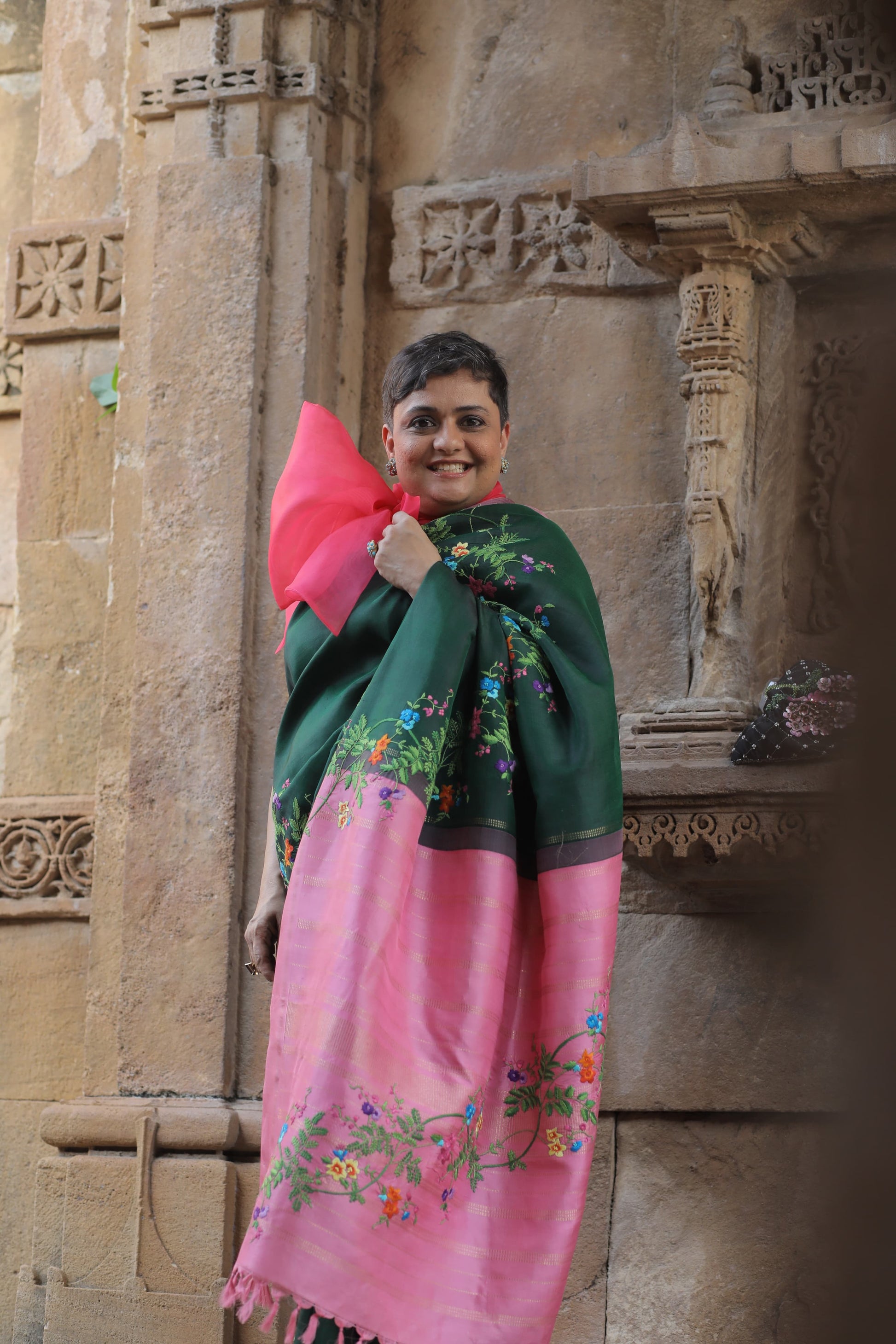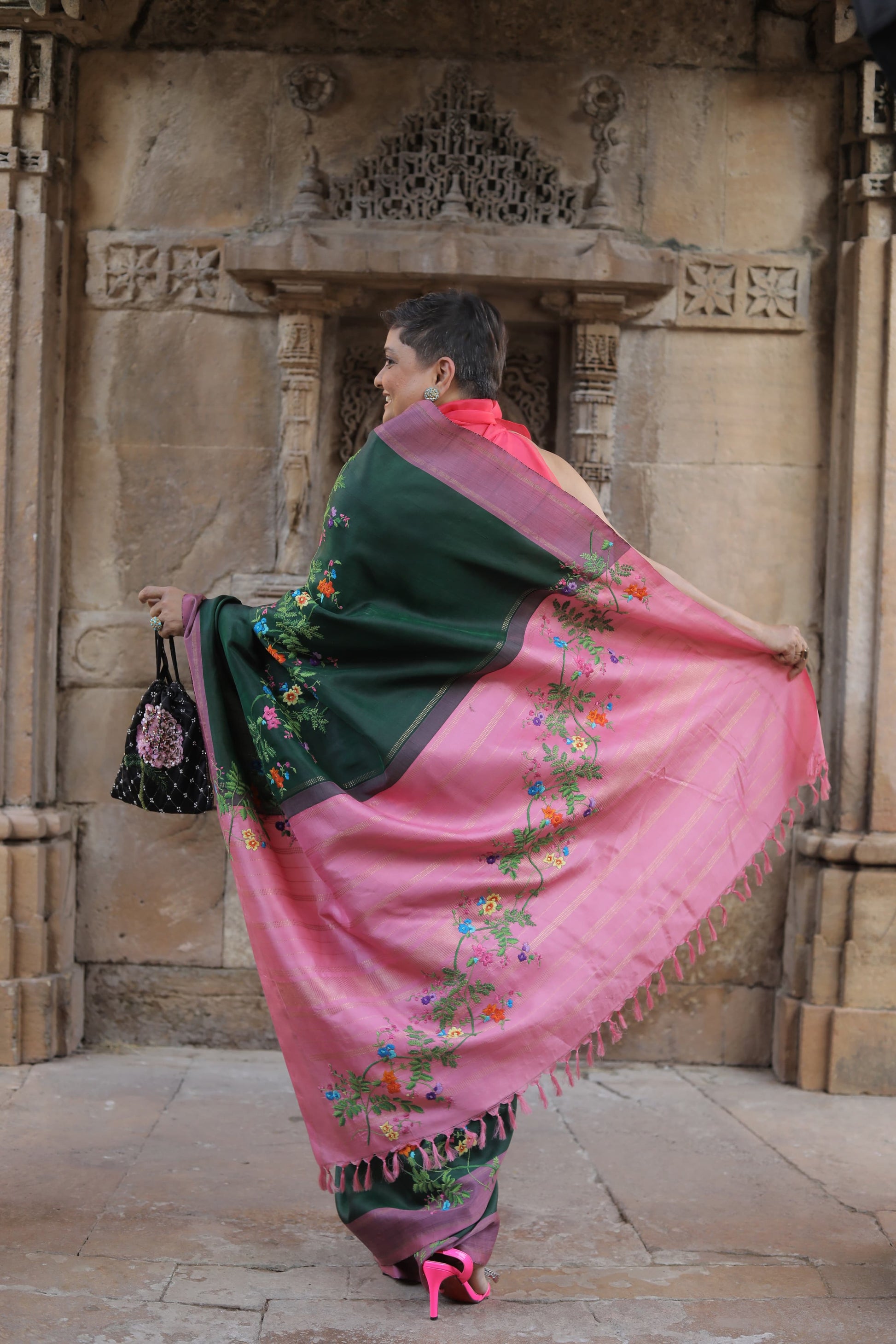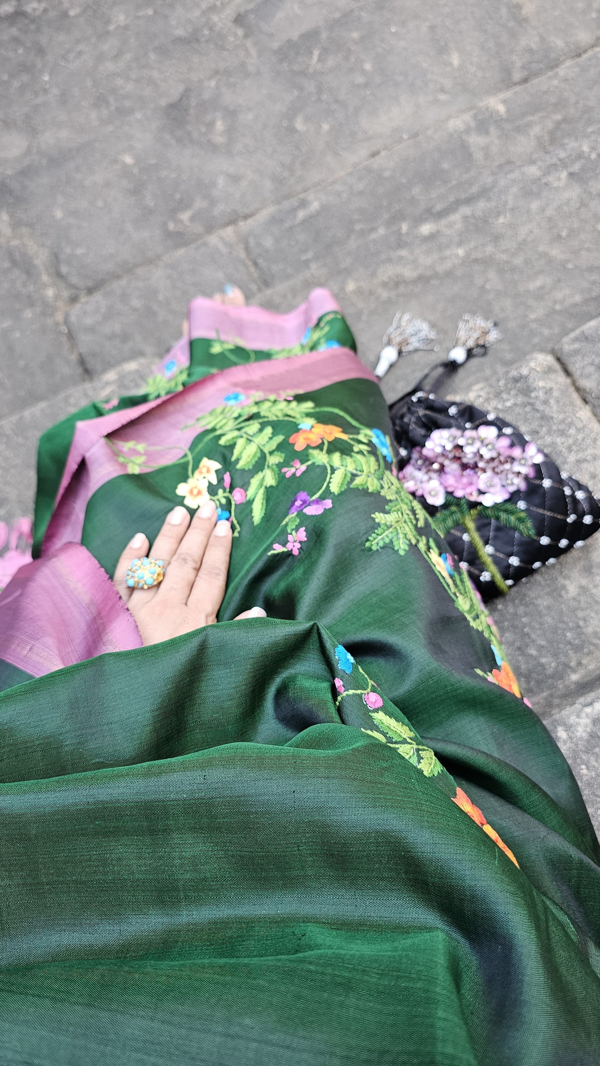 A pure silk kanjeevaram with hand parsi embroidery with hints of kantha, french knots and other techniques. The hand embroidery is extremely intricate, not regular by any means! The floral vines spaced out evenly all over the saree.