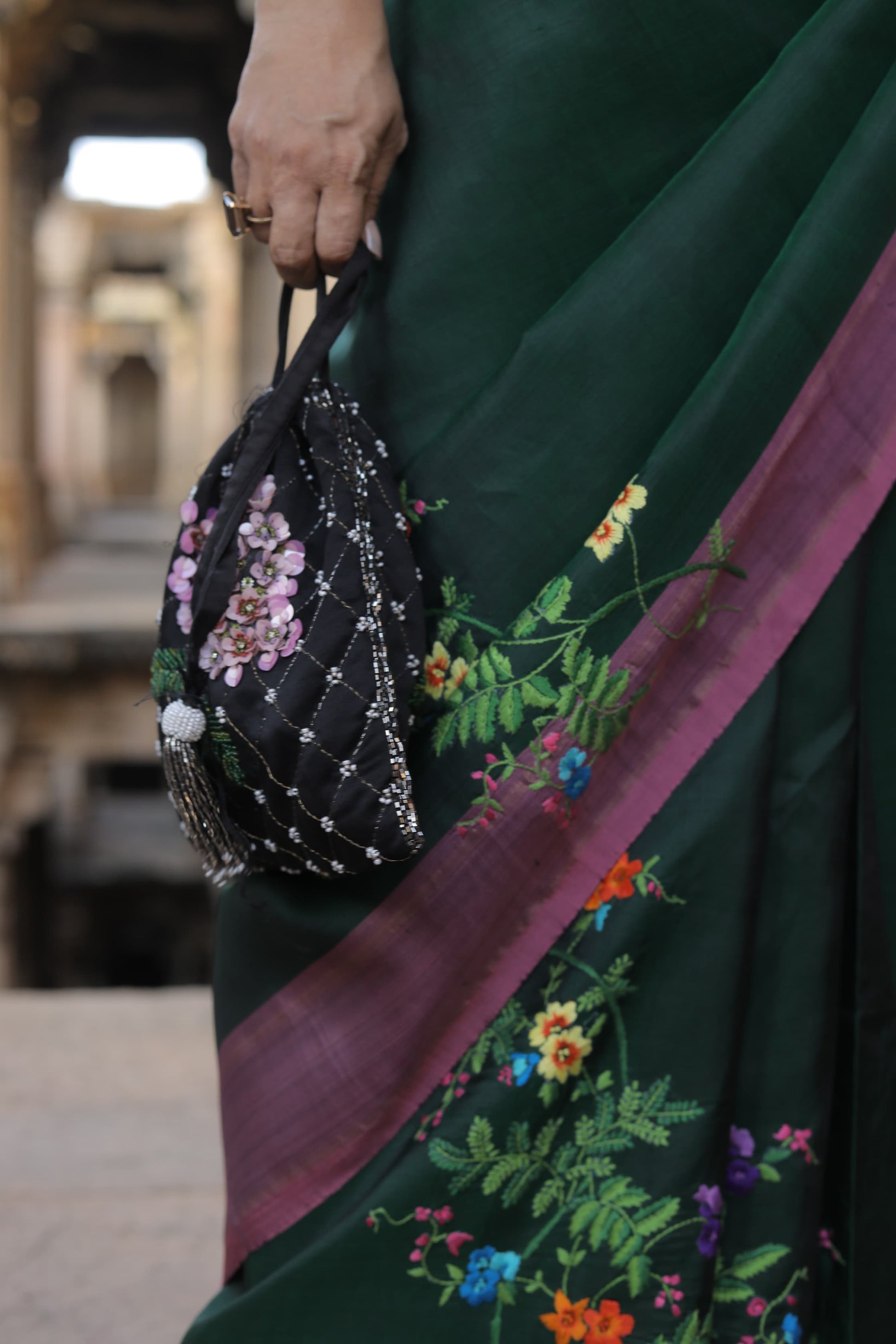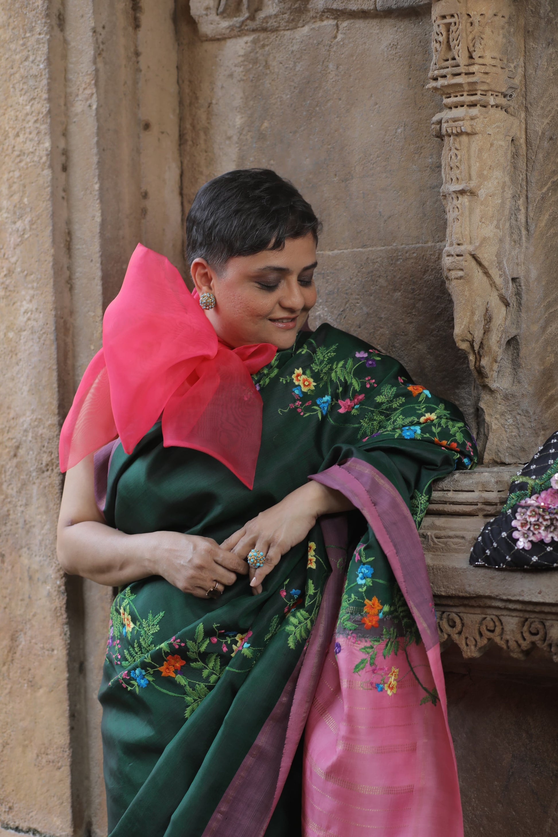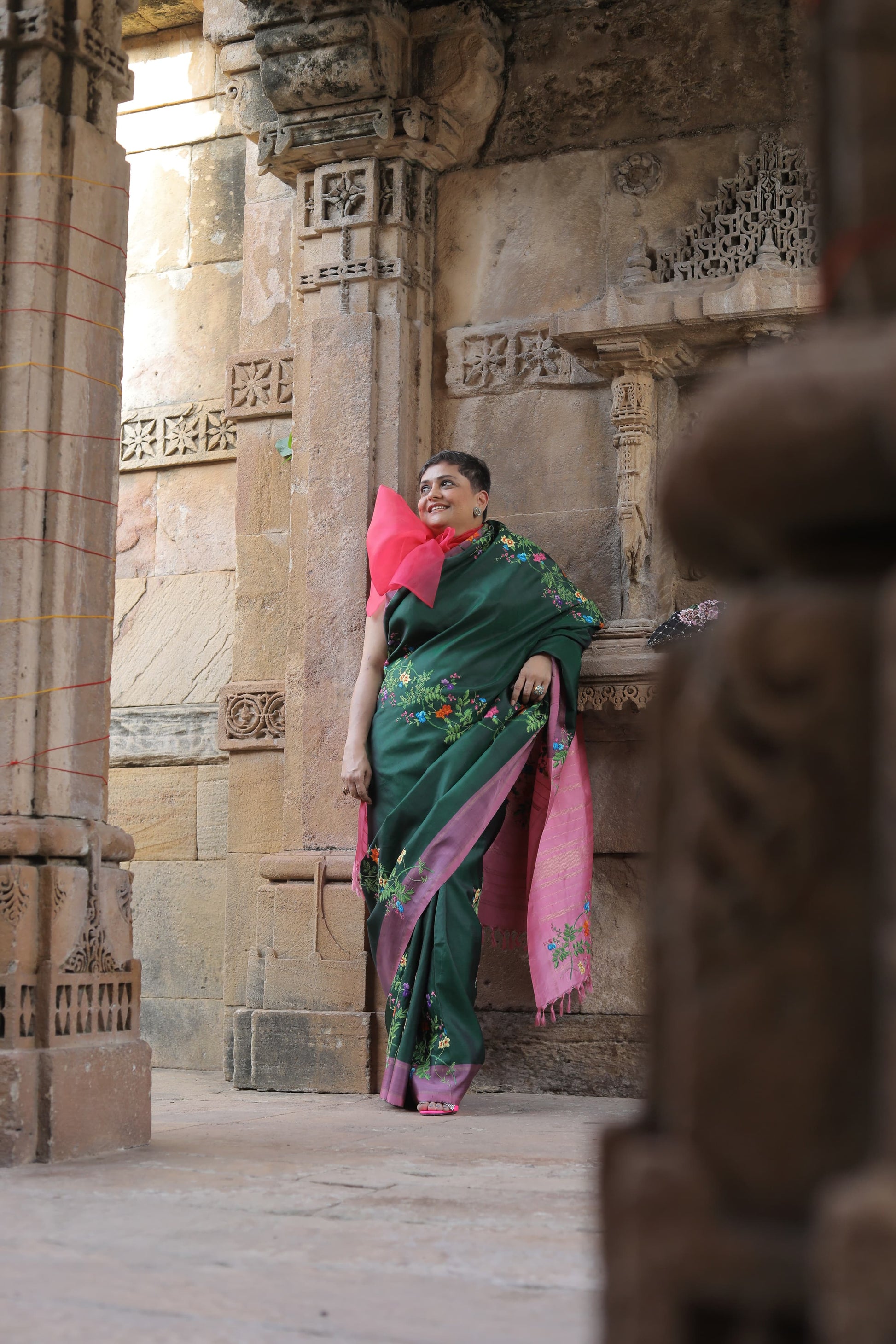 A pure silk kanjeevaram with hand parsi embroidery with hints of kantha, french knots and other techniques. The hand embroidery is extremely intricate, not regular by any means! The floral vines spaced out evenly all over the saree.