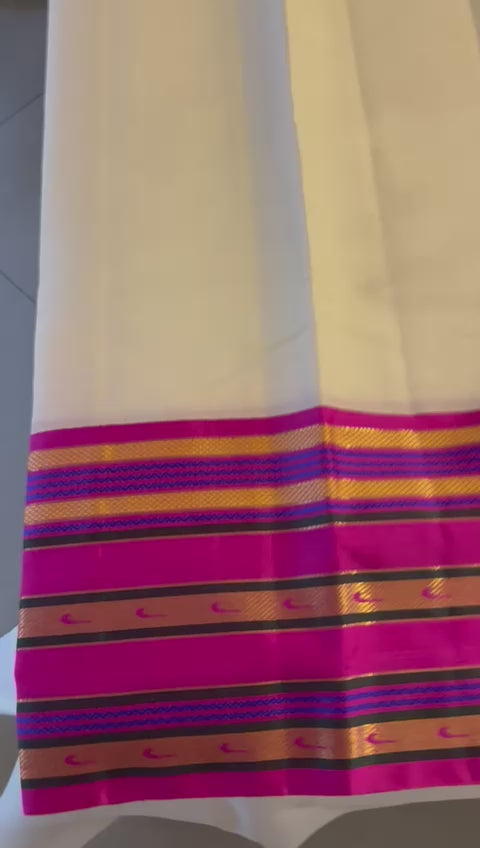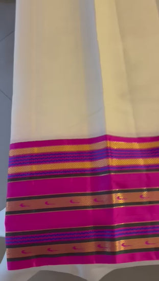 A pure kora silk saree that is stunning in it's simplicity( Kora silk is made using silk yarns that haven't been degummed, which results in a fabric that's lighter and fluffer than other silks). The border and the pallu in the pink provide contrast to the white kora body. The motifs in the border draw their inspiration from a Paithani saree from the archives of the MET museum. Saree has small motifs done in kundan work on the saree.