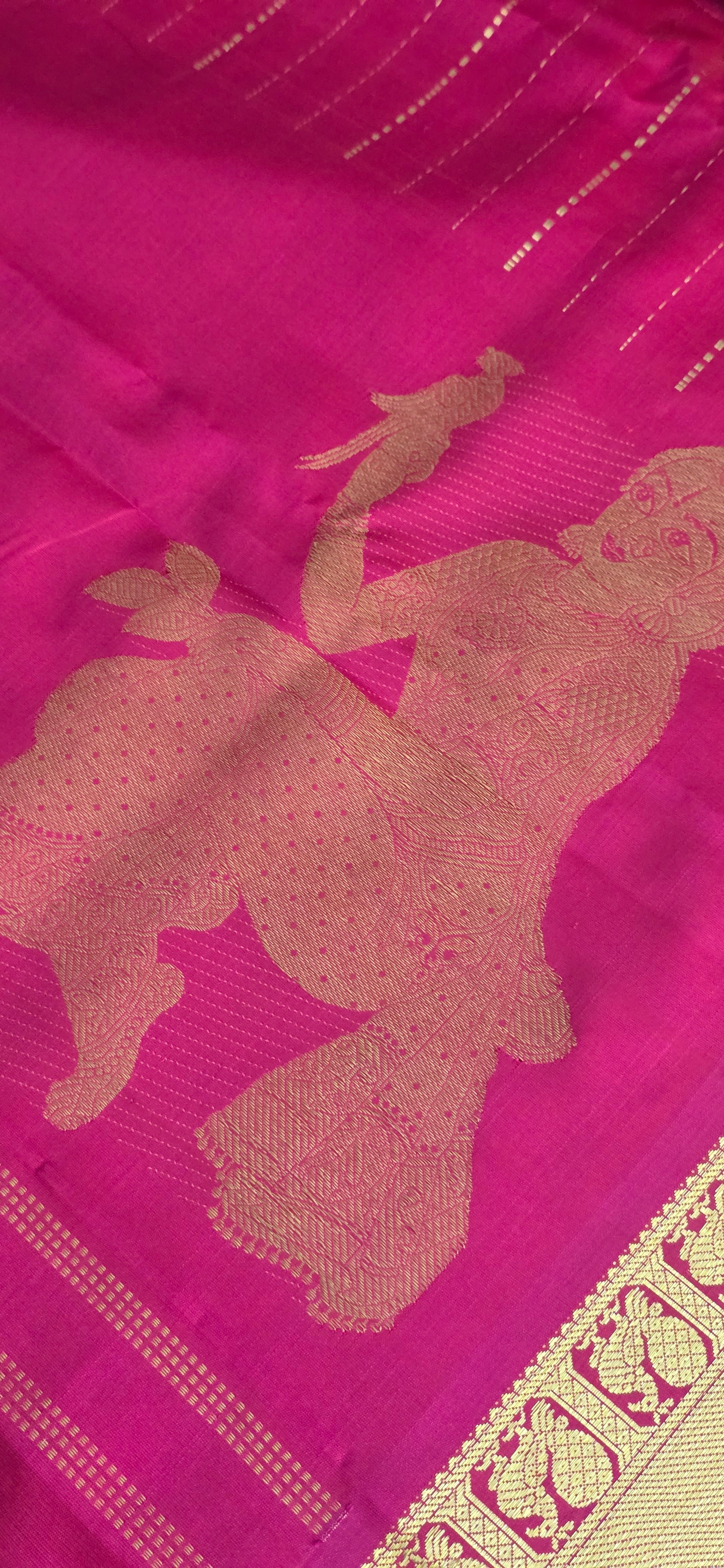 Rooted in research and woven under the expertise of master weaver Venkatesh, this piece blends devotion with craftsmanship. The saree reflects Andal’s story — her unwavering love for Vishnu and her union with Ranganatha of Srirangam.