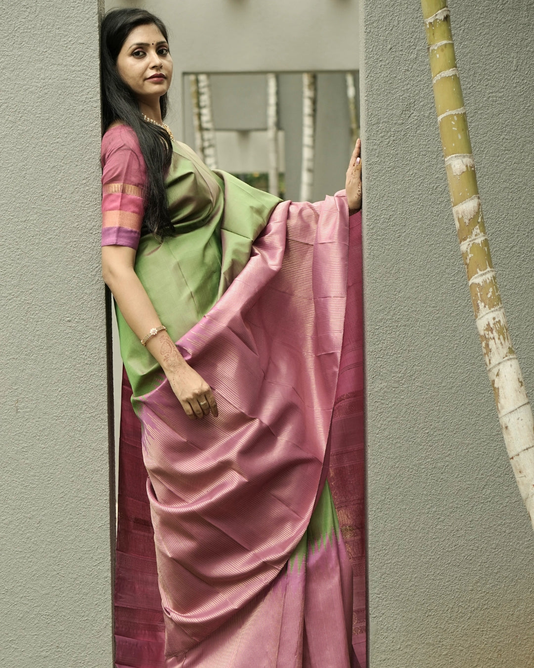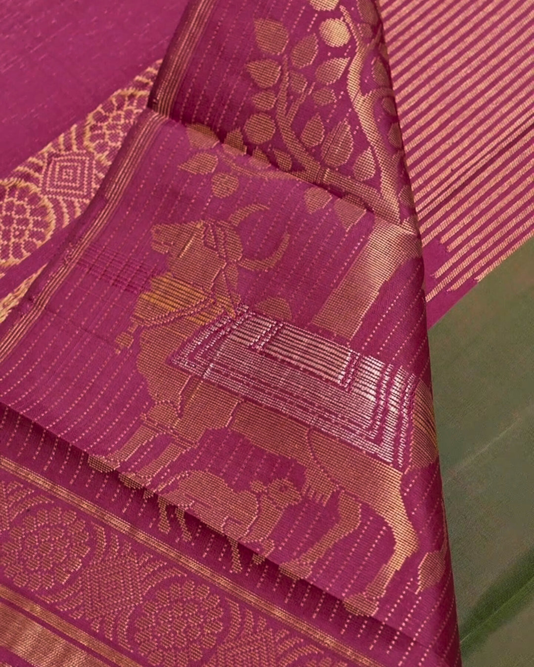 The Pure Zari Handloom Kanjivaram "Air India" Saree features a striking rising border design. Woven in onion pink with intricate gold zari and reddish-pink detailing, this saree embodies traditional elegance. Its unique characteristic is the exquisite Pichwai motifs directly woven into the fabric, a meticulous process requiring six weeks of dedicated craftsmanship. This ensemble may be complemented with a luxurious dupatta or shawl. As a celebration of India's heritage, this saree reflects the essence of Svasthi Saris, where timeless craftsmanship meets modern elegance.