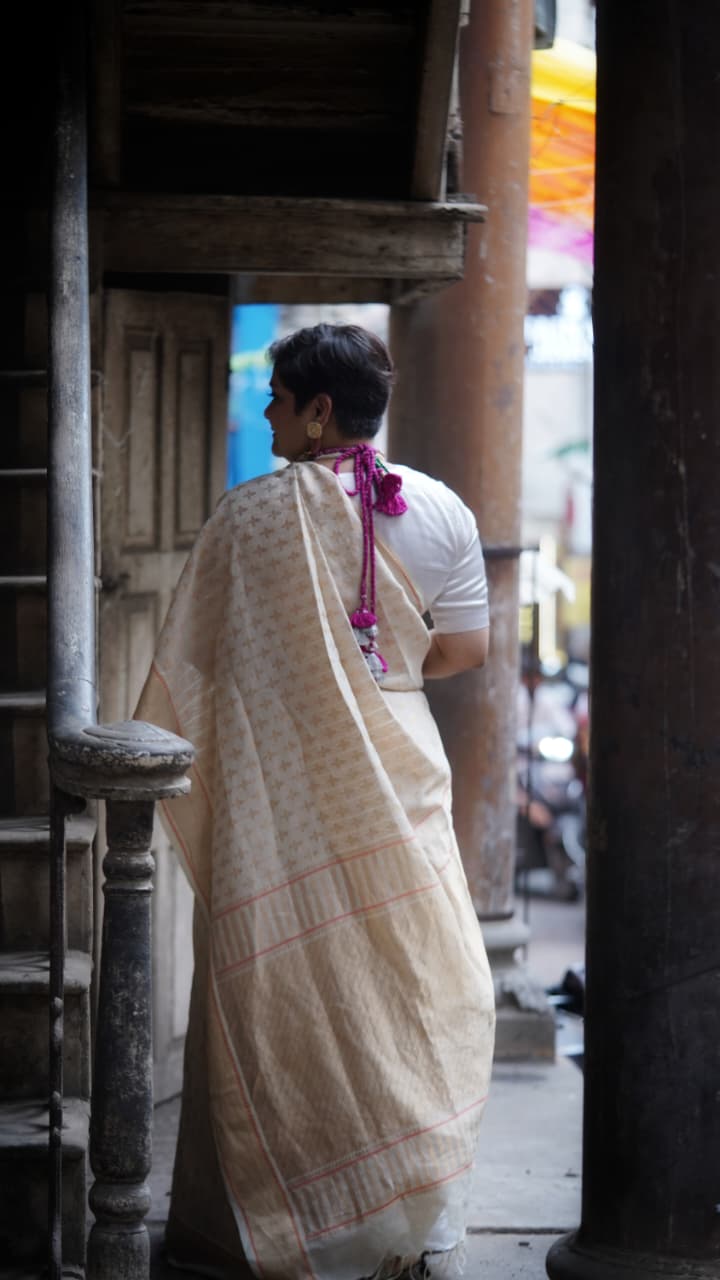 Victoria is an Onam weave that marries subtle texture with quiet splendour. Woven in a refined blend of cotton, pure silk and pure zari, this saree balances soft body, gentle sheen and luminous motifs for a dignified festive drape.