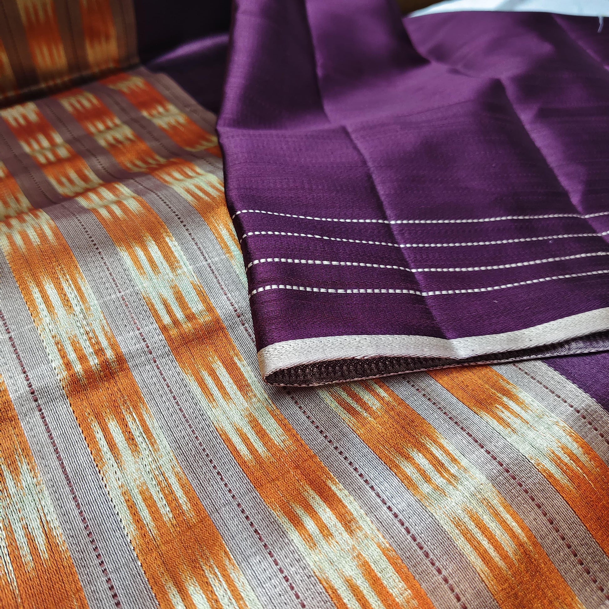 This exquisite silk Ikat Kanjeevaram saree, featuring intricate ikat geometric designs in orange, off white/badam, and Kanchana colour (brown) in the lower half of the saree, is exceptionally contemporary and elegant in contrast to the traditional upper half of Kanjivaram in Kanchana colour. The Muthu seer lines in badam colour on the edges with badam selvedge provides a completely lush and versatile aesthetic.