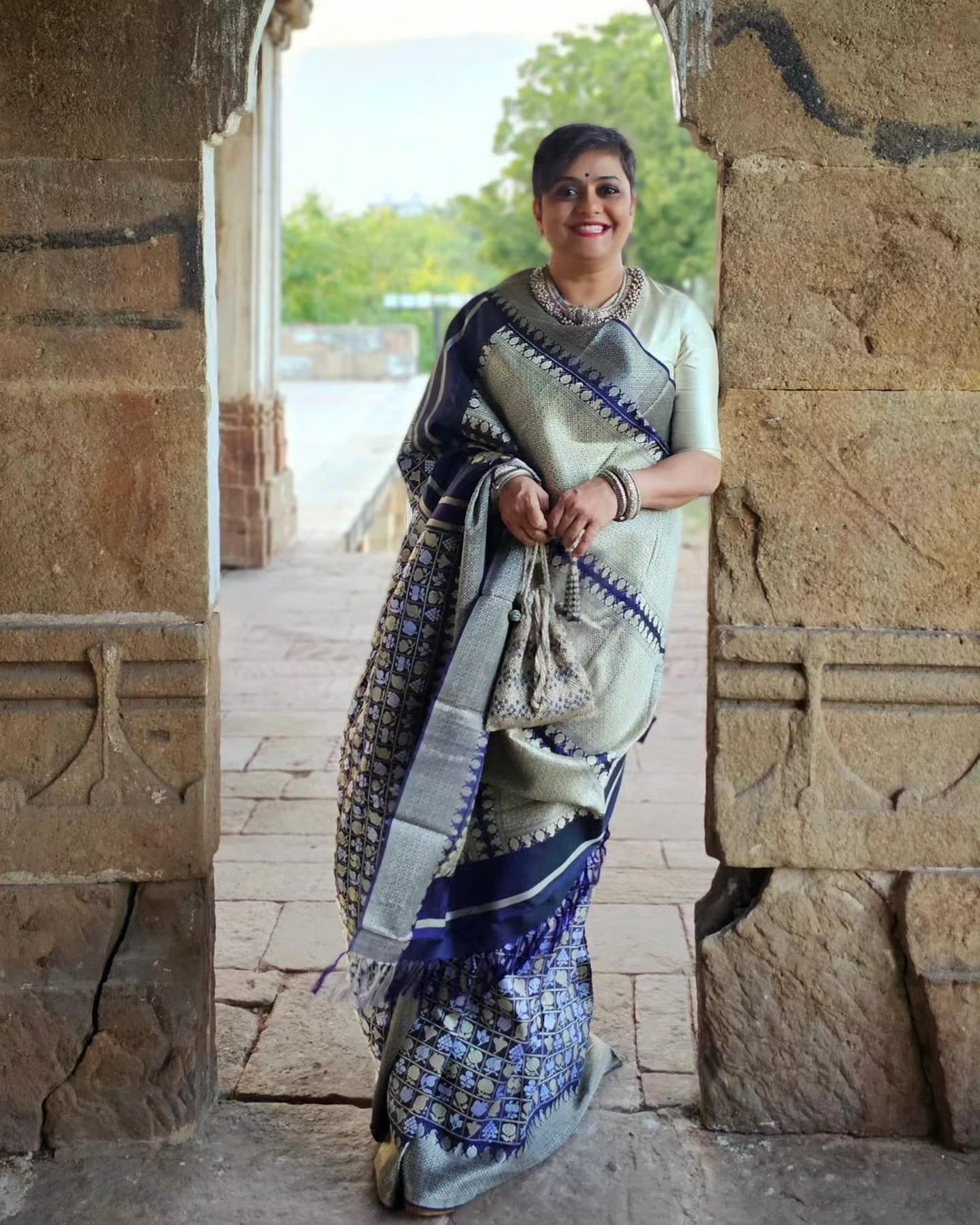 The saree has a geometric pallu,